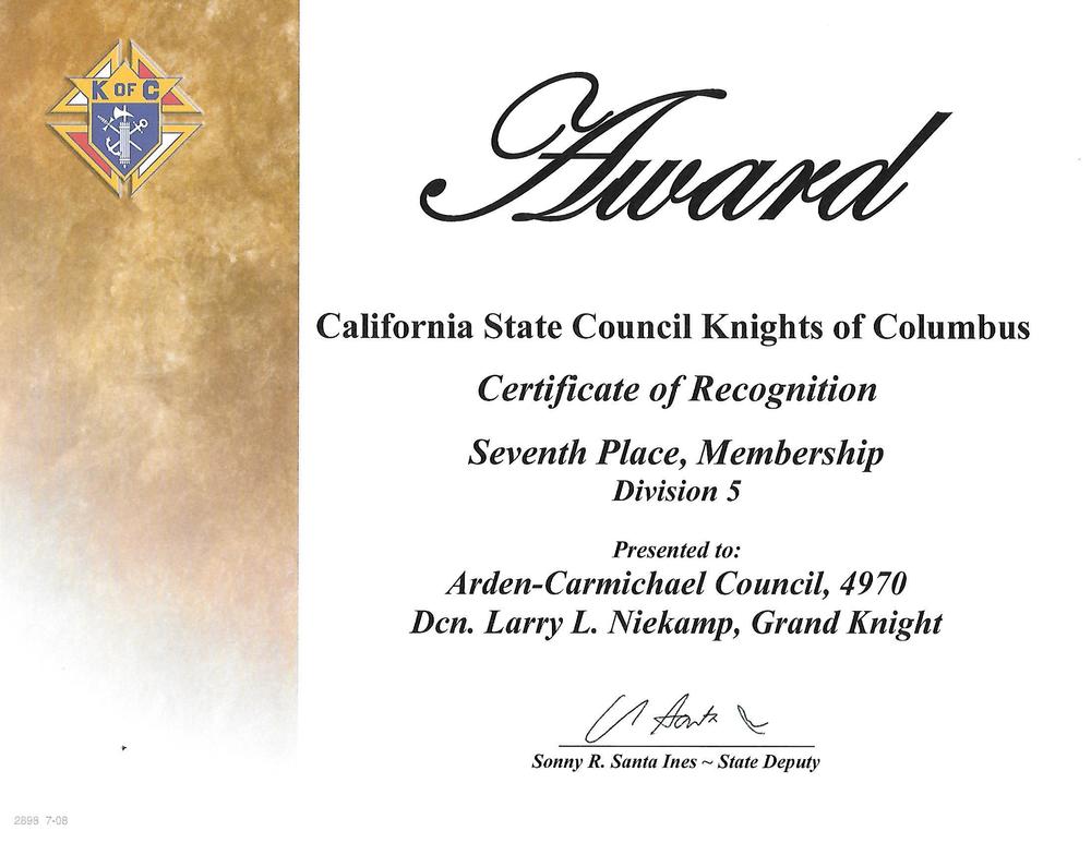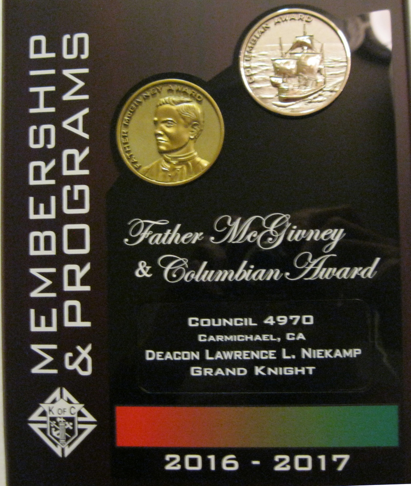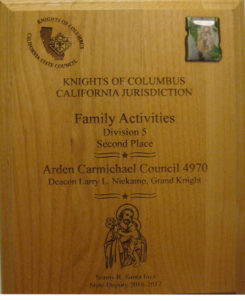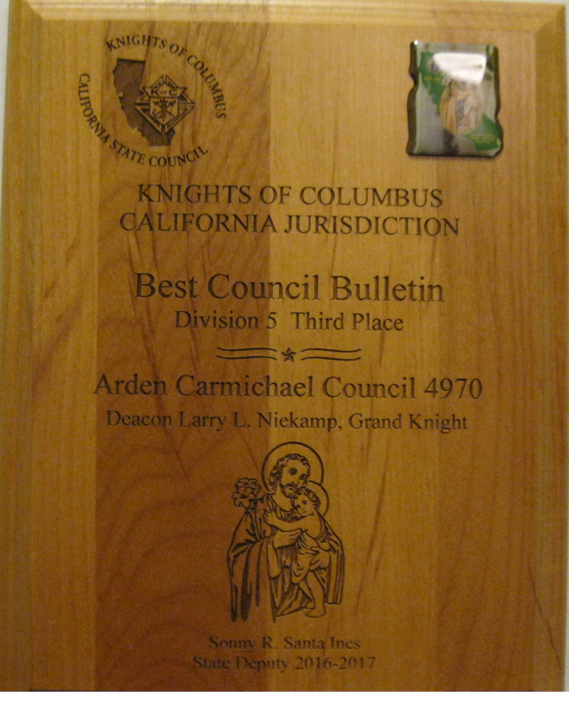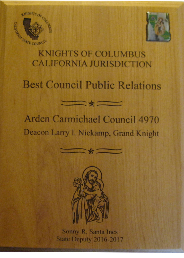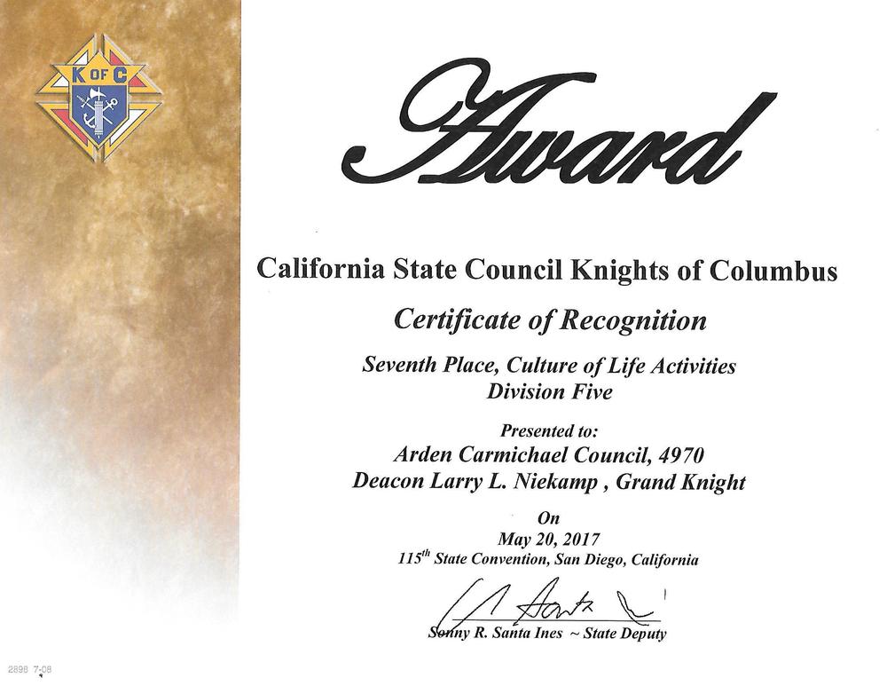 Council 4970 received well-deserved recognition for our Faith in Action programs at the 117th Annual K of C State Convention held from May 16- 18 in San Diego. We placed in all four Faith in Action categories, but did the best in Culture of life. Program requirements and judging were different this year because of the new Faith in Action program model. We also competed in a different division for the first time. First through third place winning Councils received trophies. Fourth through tenth place winners received Certificates of Recognition.